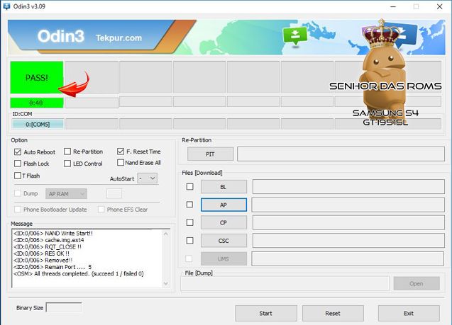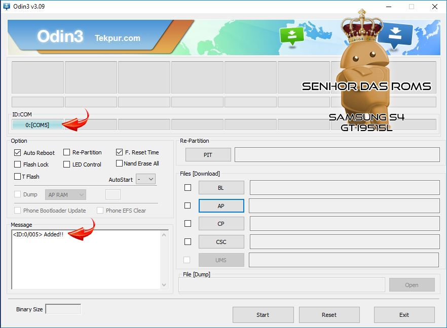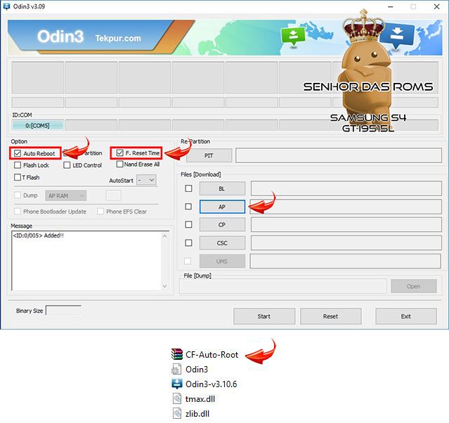 Assim que o Odin reconhecer seu aparelho, certifique-se que estão marcados na interface do Odin as opções F. Reset Time e Auto Reboot , então marque a opção AP na interface do Odin e encontre o arquivo CF Auto Root na pasta que você guardou o arquivo , após o Odin carregar o arquivo tecle a opção Start e espere seu dispositivo reiniciar.